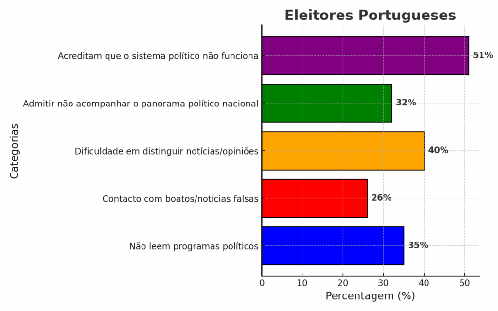 Se o abstencionista crónico demonstra impotência através da sua ausência, o eleitor desinformado vota, mas sem saber exatamente o que está a fazer. A Fundação Francisco Manuel dos Santos revela que 35% dos eleitores portugueses admitem não ler os programas políticos, antes de votar. Este número não é apenas um dado frio: é um retrato de uma escolha que é feita às cegas, onde a intuição e a influência de terceiros suplantam o conhecimento factual. Entre os jovens adultos este problema agrava-se. Dados da Pordata revelam que 47% dos eleitores, entre os 18 e os 34 anos, admitem ser influenciados por familiares e amigos, no que toca à escolha do voto, afastando-os de uma análise mais racional do contexto político português.