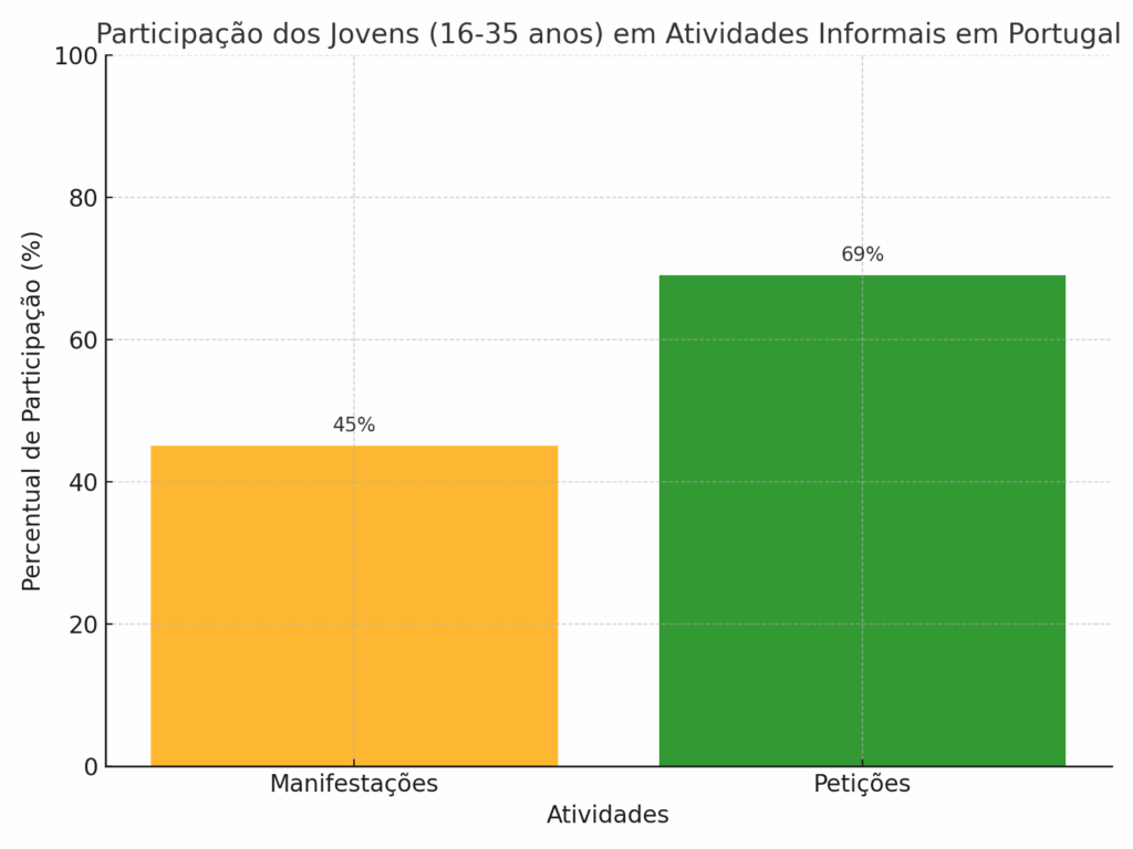A assinatura de petições emerge como a principal via de participação informal: 69% dos jovens inquiridos, com idades compreendidas entre os 16 e os 35 anos, dizem já ter recorrido a esta via. Também as greves ou as manifestações legais ocupam um lugar cimeiro (45%), o que indica uma disposição considerável para o ativismo direto. Estas formas de participação cívica são reforçadas pelo desencanto dos jovens portugueses em relação às medidas dos partidos políticos: apenas 7% dos inquiridos se encontram filiados. O que nos leva a encontrar uma tendência: os jovens preferem debater-se em torno de questões específicas, em vez de se alinharem em ideologias políticas abstratas.
